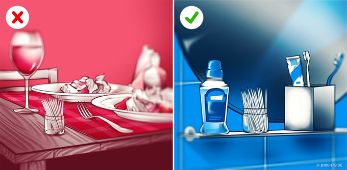 5. Xỉa răng là công việc nên làm ở nhà vệ sinh chứ không phải trên bàn ăn. Bạn muốn dùng tăm xỉa răng hay nhỏ thuốc mắt, sửa lại tóc hay make up đều nên thực hiện ở toilet mà tuyệt đối không làm khi tham gia các bữa tiệc lịch sự.