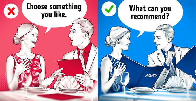 10. Người phụ nữ nên là người chọn món ăn đầu tiên. Một sai lầm phổ biến thường xảy ra là người đàn ông sẽ chọn món ăn mà anh ta thích trước. Cách tốt nhất là cô gái có thể nhờ anh chàng đi cùng đưa ra đề nghị cho mình xem nên ăn món nào. Sau đó, người đàn ông sẽ là người sau cùng chốt order với người phục vụ.
