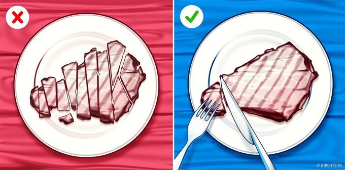 8. Đừng cắt toàn bộ miếng thịt thành những mẩu vụn nhỏ, nó sẽ khiến món ăn bị nguội nhanh và mất đi mùi vị của nó. Tốt nhất là cắt đến đâu ăn đến đó.