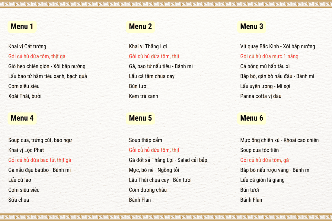 Mời bạn tham khảo một số thực đơn tiệc cưới tại Nhà hàng Thắng Lợi An Giang có kết hợp món Gỏi củ hủ dừa.