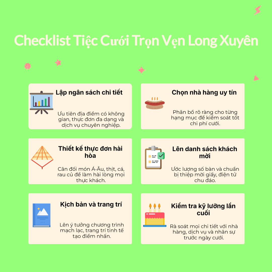 CHECKLIST ĐẶT TIỆC CƯỚI TẠI LONG XUYÊN: 10 ĐIỀU CẦN CHUẨN BỊ