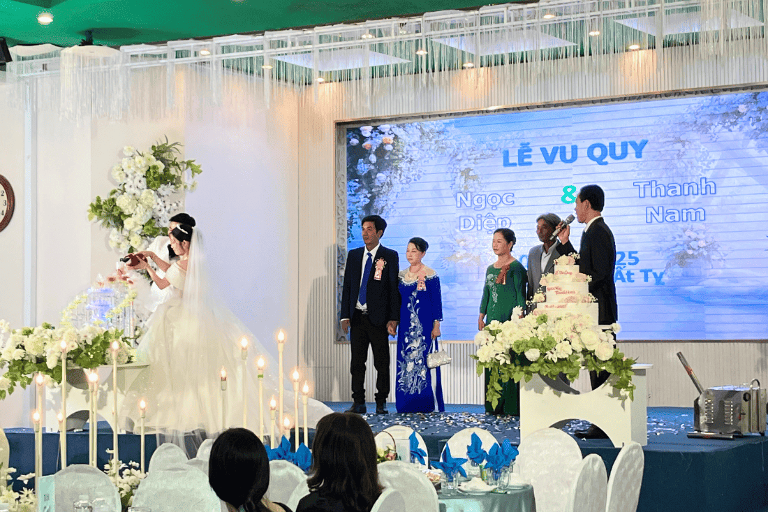 - Sân khấu trang trí, màn hình LED, bánh cưới